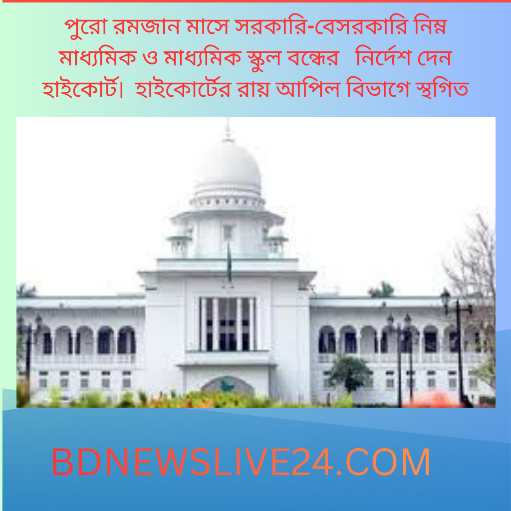 পুরো রমজান মাসে সরকারি-বেসরকারি নিম্ন মাধ্যমিক ও মাধ্যমিক স্কুল বন্ধ রাখতে হাইকোর্টের দেওয়া আদেশ স্থগিত করেছেন আপিল বিভাগের চেম্বার আদালত।